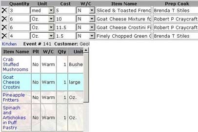 This screen shows how menus are quantified. Each menu is listed and shows the prep quantities and tasks. The chef has assigned 2 prep cooks to prepare the Goat Cheese Crostini appetizer. A printout can be generated for the shopping list and an estimated cost sent to the sales person.
